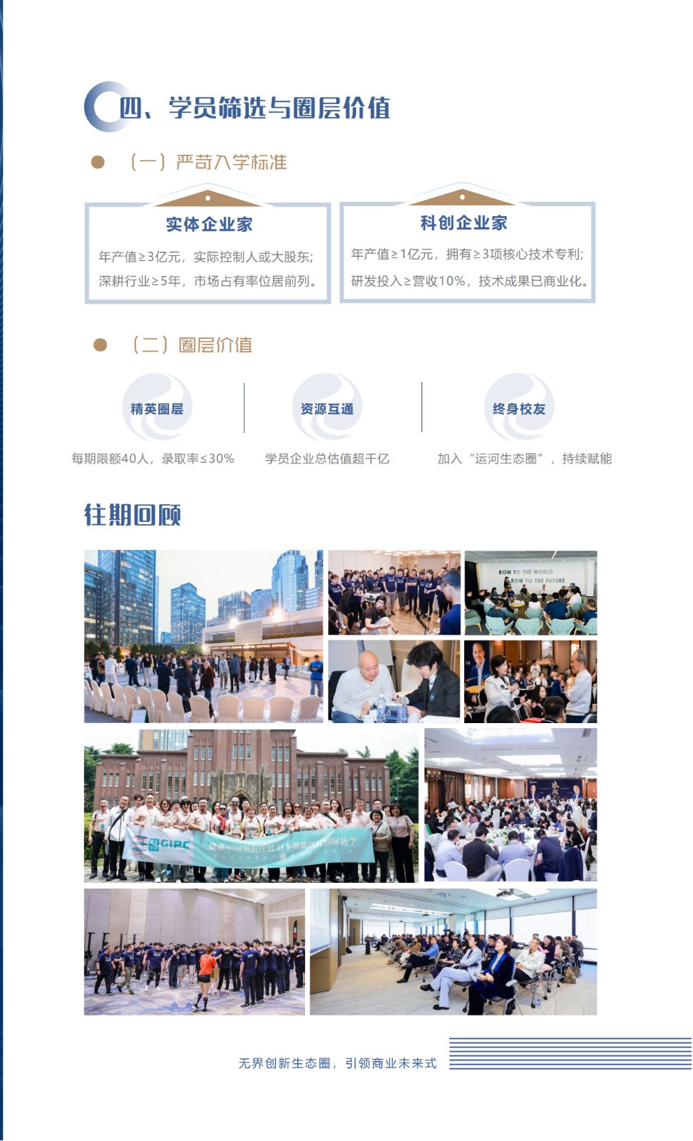 招生对象实体企业家:年产值3亿以上,实际控制人或大股东,深耕行业5年以上,市场占有率居前列; 科创企业家:年产值1亿以上,拥有3项以上的核心技术专项,研发投入大于应收10%,技术成果已商业化。