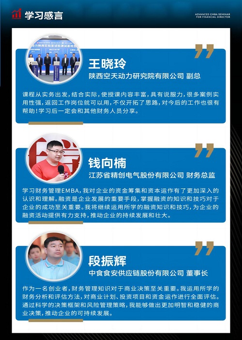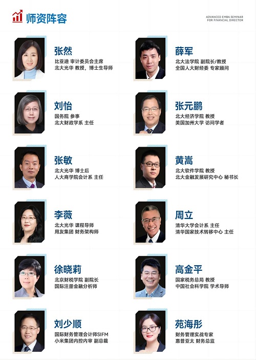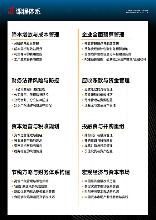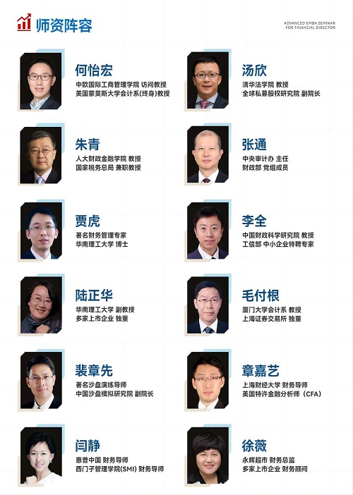 招生对象企事业单位总会计师、财务总监、财务主管、战略投融资等财经业内人士; 董事长、董事、总裁、总经理、副总等企业财务决策和管理者。